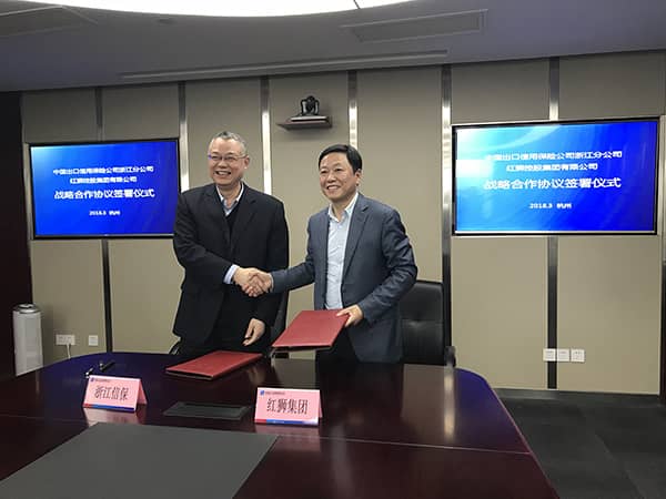 中國信保浙江分公司總經(jīng)理胡擁軍、紅獅集團董事長章小華代表雙方簽約。中國信保浙江分公司副總經(jīng)理林晨及相關部門領導、紅獅集團班子成員章旭喜等參加簽約儀式。