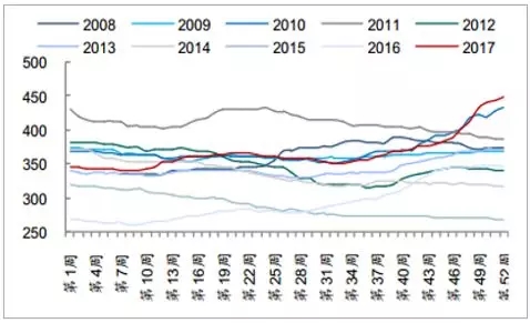 目前北方十五省進入錯峰生產(chǎn)階段已經(jīng)一至兩個月,并至少持續(xù)到明年 3 月中旬;同時伴隨最強錯峰季,部分區(qū)域因受霧霾天氣影響,已先后啟動重污染天氣應(yīng)急響應(yīng);南方局部地區(qū)額外限產(chǎn)則再度超出市場預(yù)期。從目前市場表現(xiàn)來看,水泥價格在冬季仍然實現(xiàn)穩(wěn)步上漲,最新全國水泥平均價格實現(xiàn) 448.3 元/噸,達到歷史同期最高位水平;水泥庫容比目前為 50%,處于近年來歷史最低水平。這個冬季,整個水泥行業(yè)完全印證了我們 2017 年 10 月初發(fā)布冬季策略做出的行業(yè)預(yù)判《這個冬天不太冷》以及 12 月初發(fā)布的年度策略報告《新均衡,新思路》,暖冬格局基本形成。