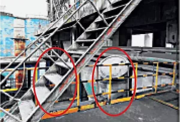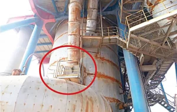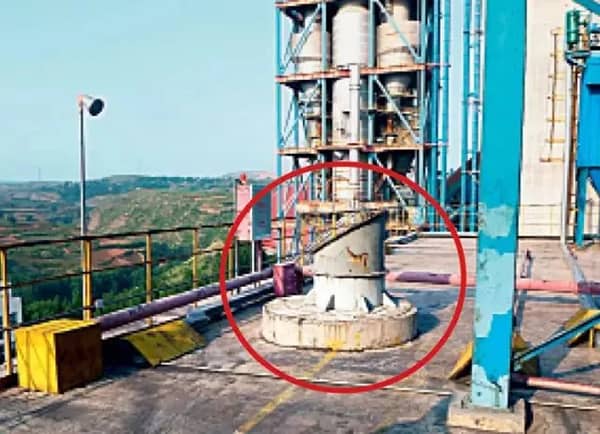 4 、水泥廠預(yù)熱器系統(tǒng)下料管清堵孔處設(shè)置了平臺(tái),且直梯進(jìn)入,平臺(tái)狹窄無逃生通道。若出現(xiàn)熱物料異常噴出,作業(yè)人員無法逃離,容易造成熱物料的高溫灼燙傷害。