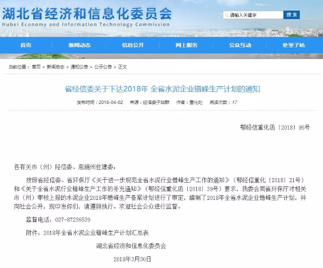 2018年全省水泥企業(yè)錯峰生產(chǎn)計劃匯總表