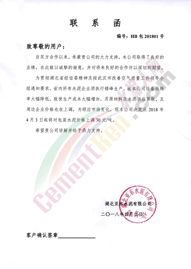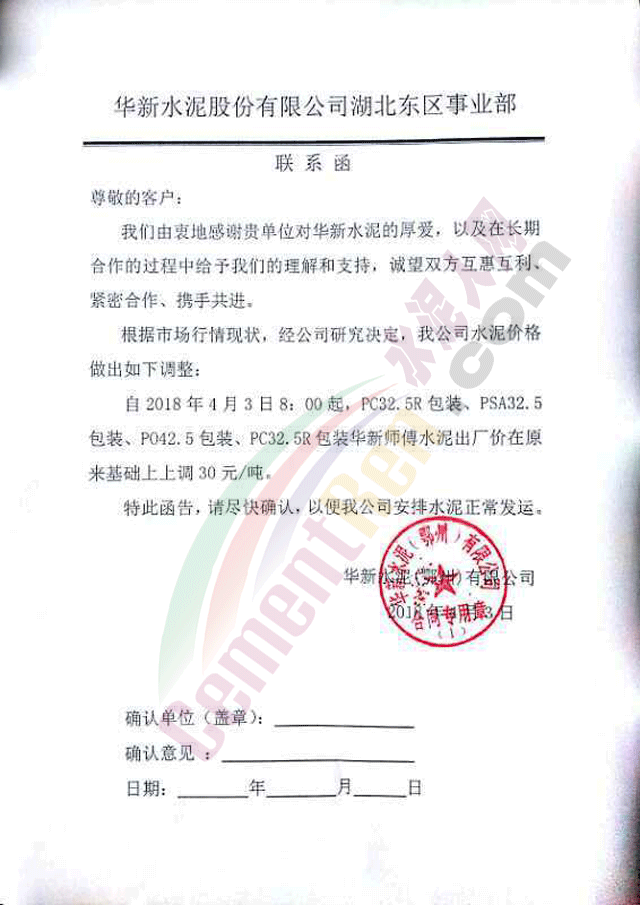 隨著錯峰生產(chǎn)計劃發(fā)布,湖北武漢周邊區(qū)域的華新水泥、亞東水泥、媧石水泥、三峽水泥等企業(yè)發(fā)通知上調(diào)水泥價格,其中袋裝水泥上調(diào)30元/噸,散裝水泥上調(diào)45元/噸。調(diào)價函如下: