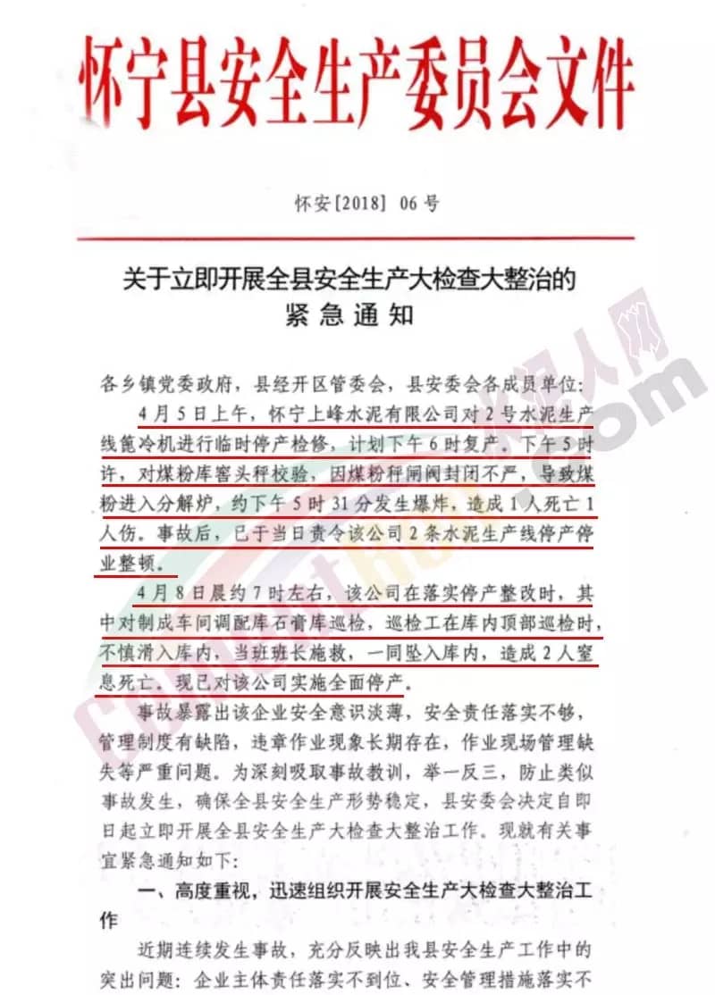 4月8日晨,約7時左右,該公司在落實停產(chǎn)整改時,其中對制成車間調(diào)配庫石膏庫巡檢,巡檢工在庫內(nèi)頂部巡檢時,不慎滑入庫內(nèi),當班班長施救,一同墜入庫內(nèi),造成2人窒息死亡,現(xiàn)已對該公司實施全面停產(chǎn)。