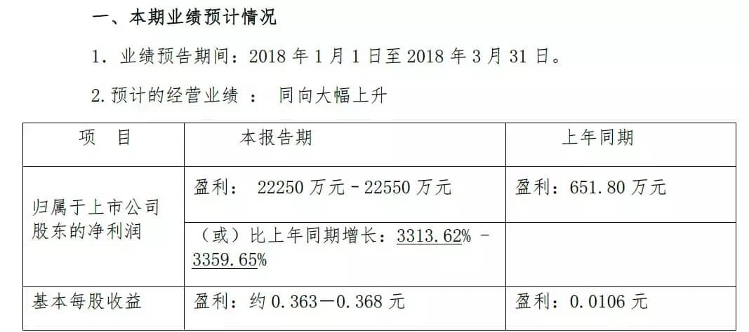1.經(jīng)財(cái)務(wù)部門初步測(cè)算,預(yù)計(jì)2018年第一季度實(shí)現(xiàn)歸屬于上市公司股東的凈利潤(rùn)與上年同期相比,將實(shí)現(xiàn)扭虧為盈,實(shí)現(xiàn)歸屬于上市公司股東的凈利潤(rùn)8600萬(wàn)元左右。