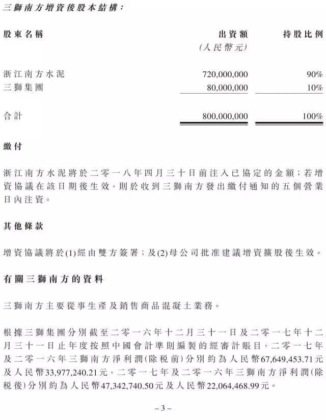 公告顯示,三獅南方主要從事生產(chǎn)及銷售商品混凝土業(yè)務(wù)。截至2016年、2017年12月31日止年度按照中國會計準(zhǔn)則編制的經(jīng)審計賬目,其稅前凈利潤分別約人民幣6764.9萬元及3397.7萬元,稅后凈利潤分別約人民幣4734.27萬元及2206.45萬元。