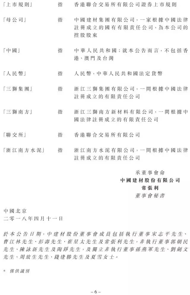 中國建材(9.29, -0.12, -1.27%)(03323)公布,2018年4月11日,由公司間接持股50%、母公司間接持股50%的浙江三獅南方新材料有限公司(“三獅南方”)訂立增資協(xié)議,據(jù)此,公司附屬浙江南方水泥以現(xiàn)金方式向三獅南方增資。其中,新增注冊資本人民幣6.4億元,資本公積金出資人民幣約2.34億元。