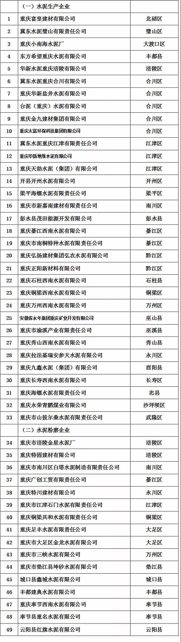 重慶市水泥等高耗能行業(yè)專項(xiàng)監(jiān)察企業(yè)名單
