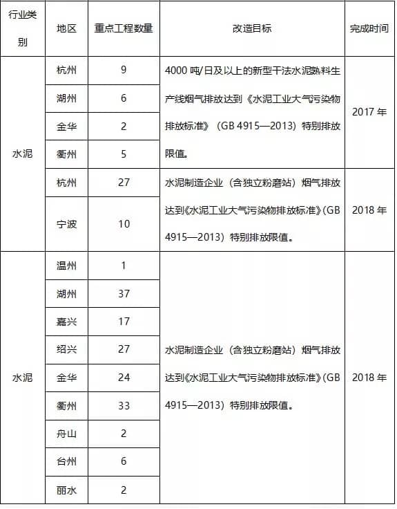 2017年3月17日浙江省發(fā)改委會同浙江省環(huán)保廳聯(lián)合印發(fā)《浙江省大氣污染防治“十三五”規(guī)劃》,規(guī)劃提出水泥行業(yè)廢氣清潔排放改造,推廣使用高效、成熟的脫硝技術(shù)和除塵技術(shù),2017年底前,規(guī)模4000噸/日及以上的新型干法水泥熟料生產(chǎn)線煙氣排放達(dá)到《水泥工業(yè)大氣污染物排放標(biāo)準(zhǔn)》(GB4915—2013)的特別排放限值要求,2018年6月30日前,所有水泥制造企業(yè)(含獨(dú)立粉磨站)廢氣排放達(dá)到特別排放限值要求。