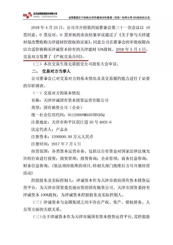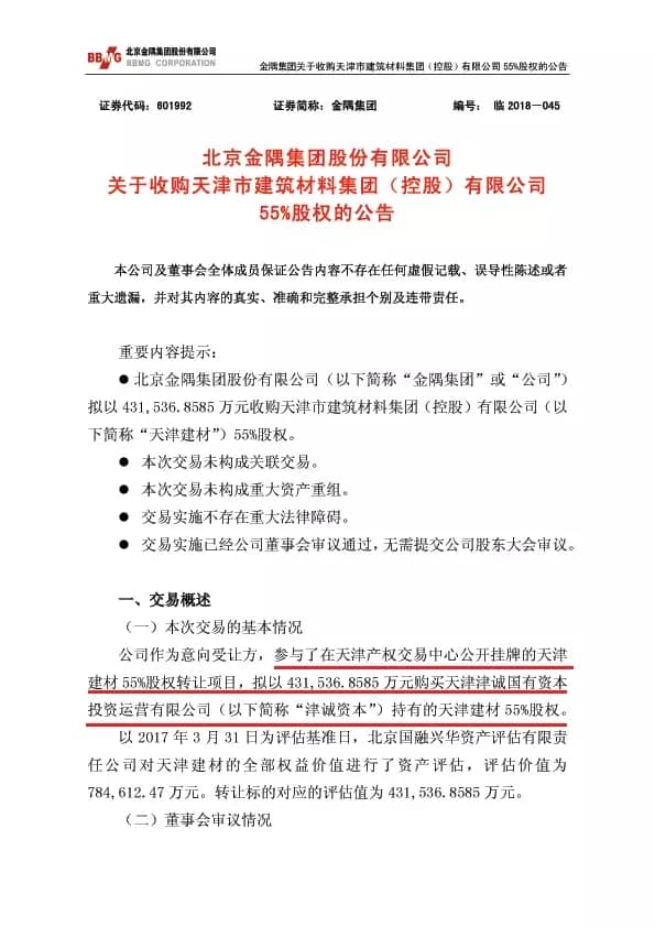 2018年1月,天津建材100%股權(quán)由天津市國(guó)資委劃轉(zhuǎn)至新成立的國(guó)資運(yùn)營(yíng)平臺(tái)公司——津誠(chéng)資本,由津誠(chéng)資本通過(guò)天津產(chǎn)權(quán)交易中心公開(kāi)掛牌轉(zhuǎn)讓天津建材55%股權(quán)。2018年3月29日,天津建材55%股權(quán)轉(zhuǎn)讓事項(xiàng)正式掛牌,最終金隅集團(tuán)以40.18億元成功摘牌。