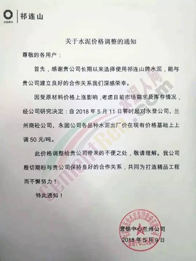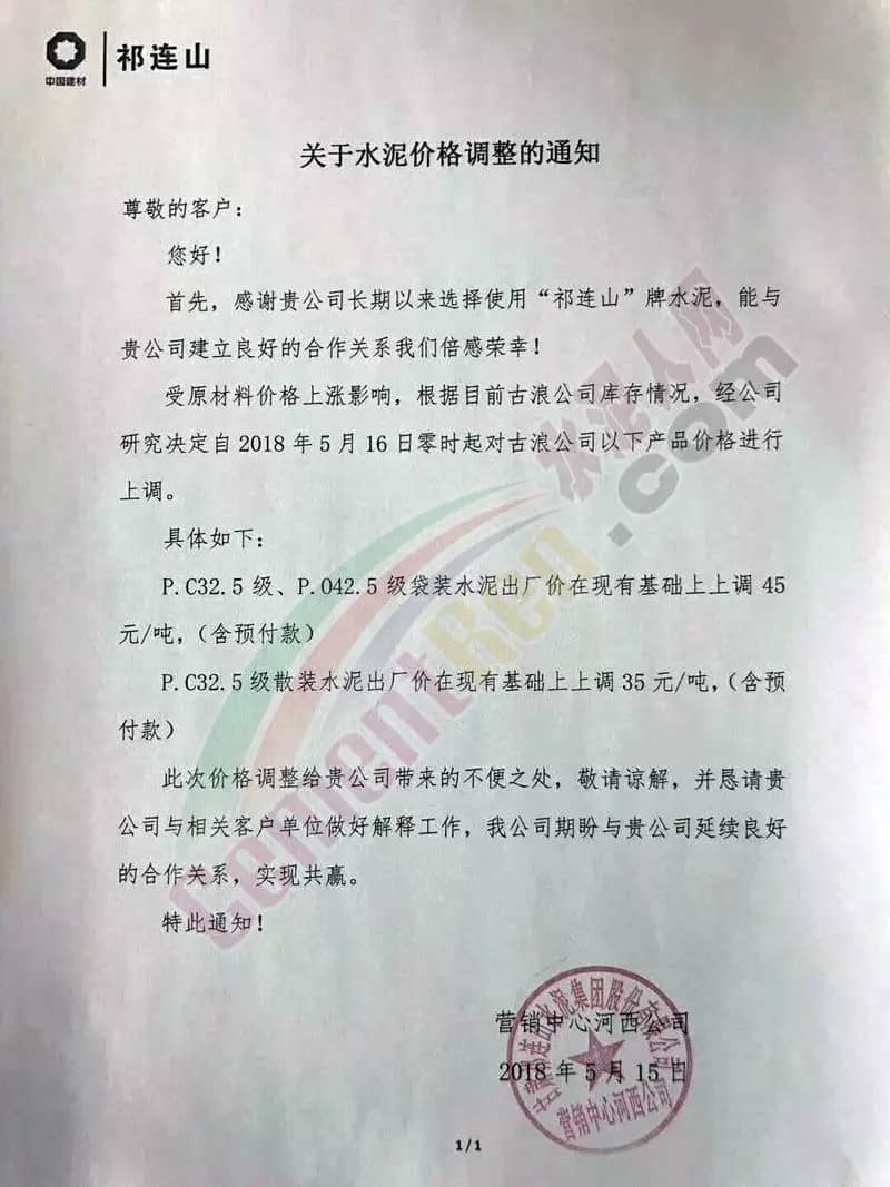 同是這家集團企業(yè),曾在12日零時針對古浪祁連山水泥上調(diào)價格。主要是針對P.O42.5散裝水泥在原執(zhí)行價格基礎(chǔ)上上調(diào)35元/噸(含預(yù)付款)。