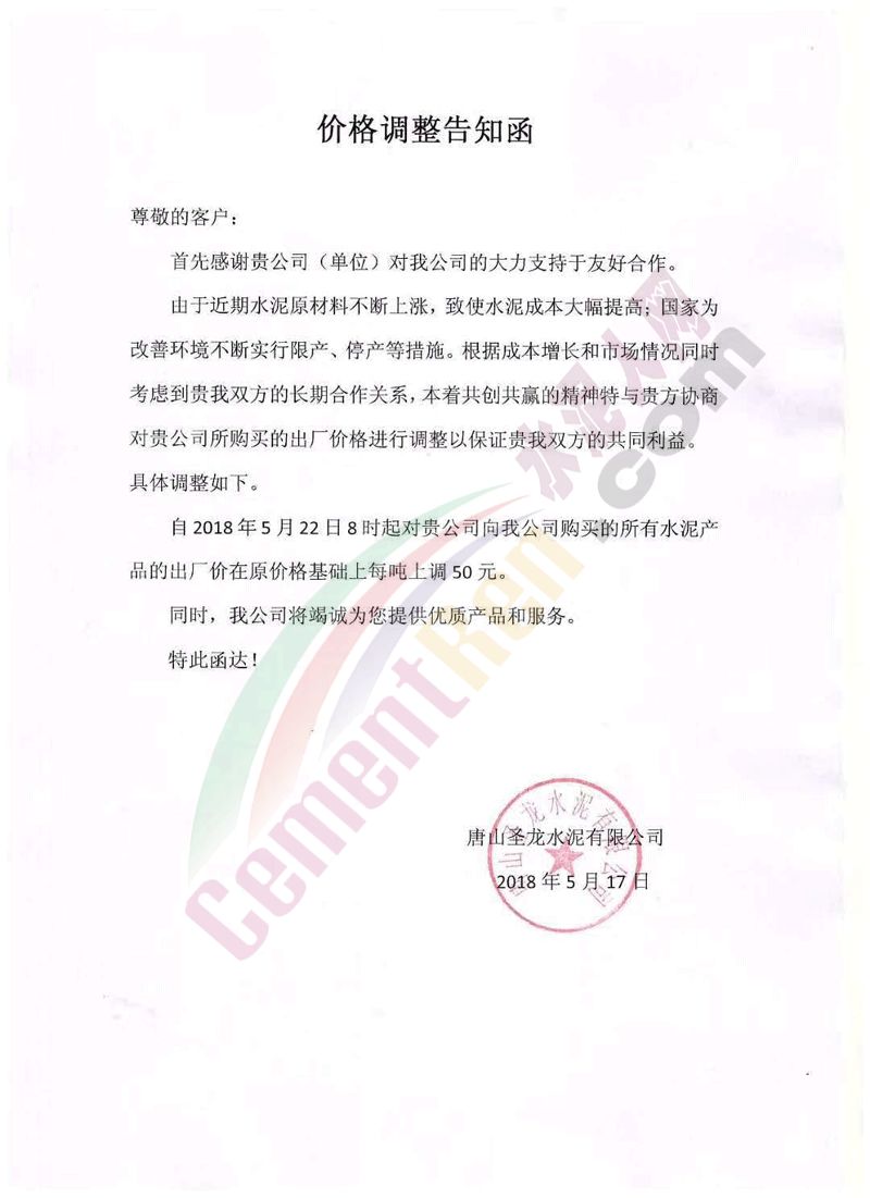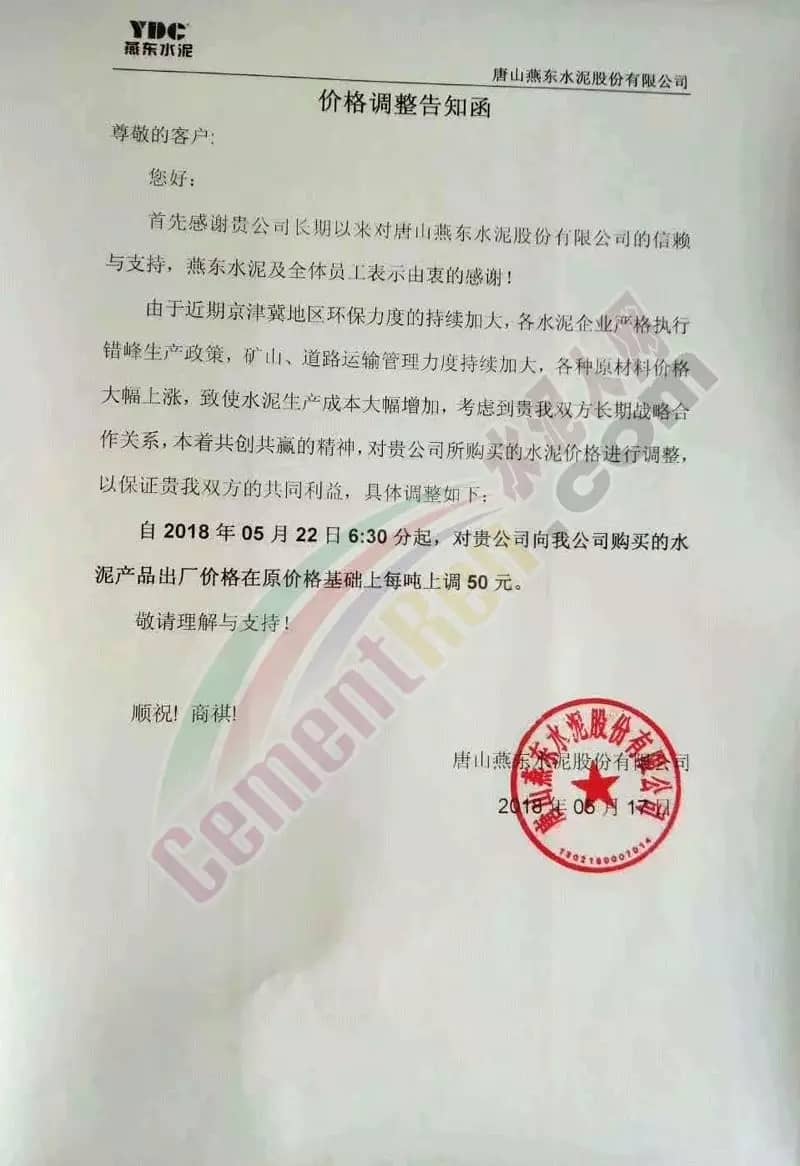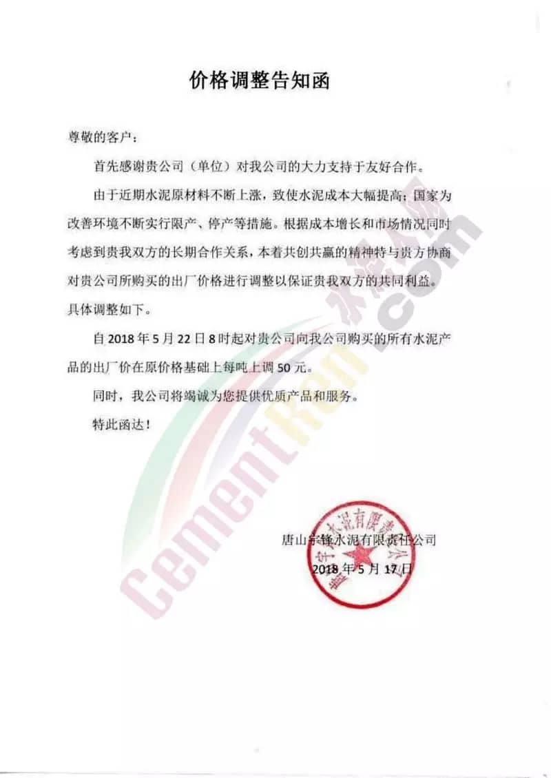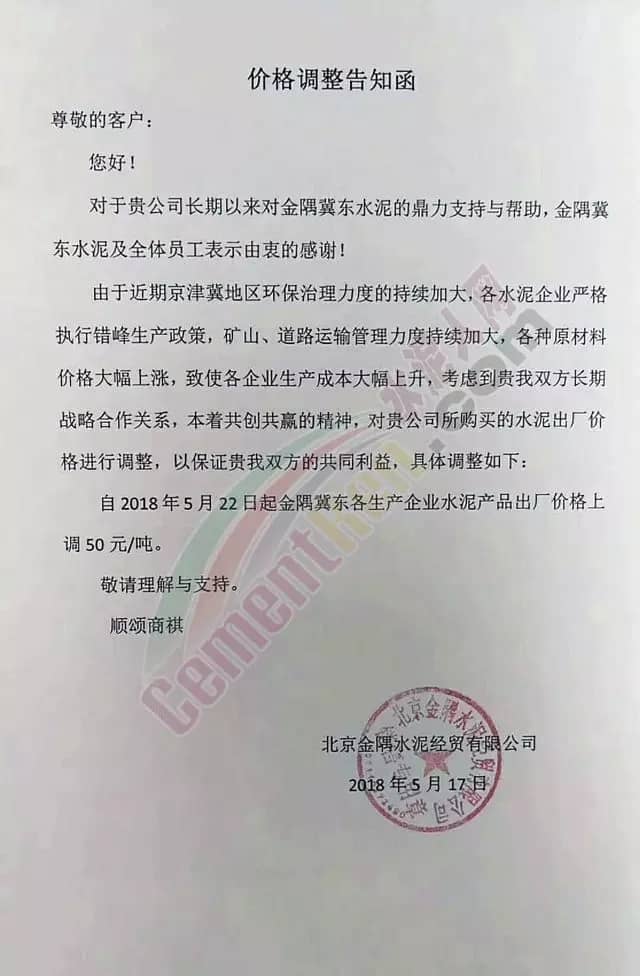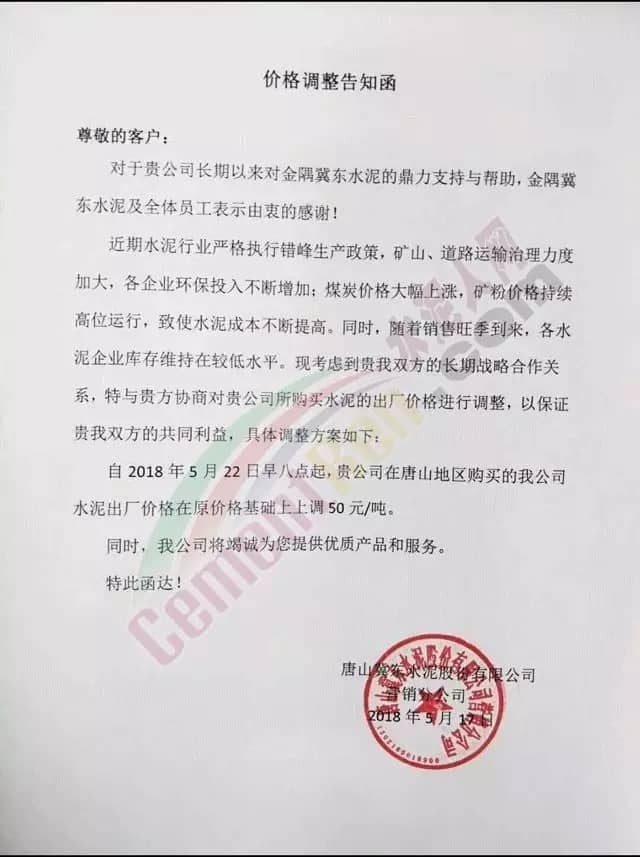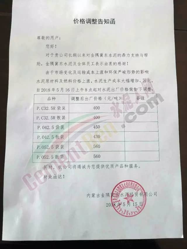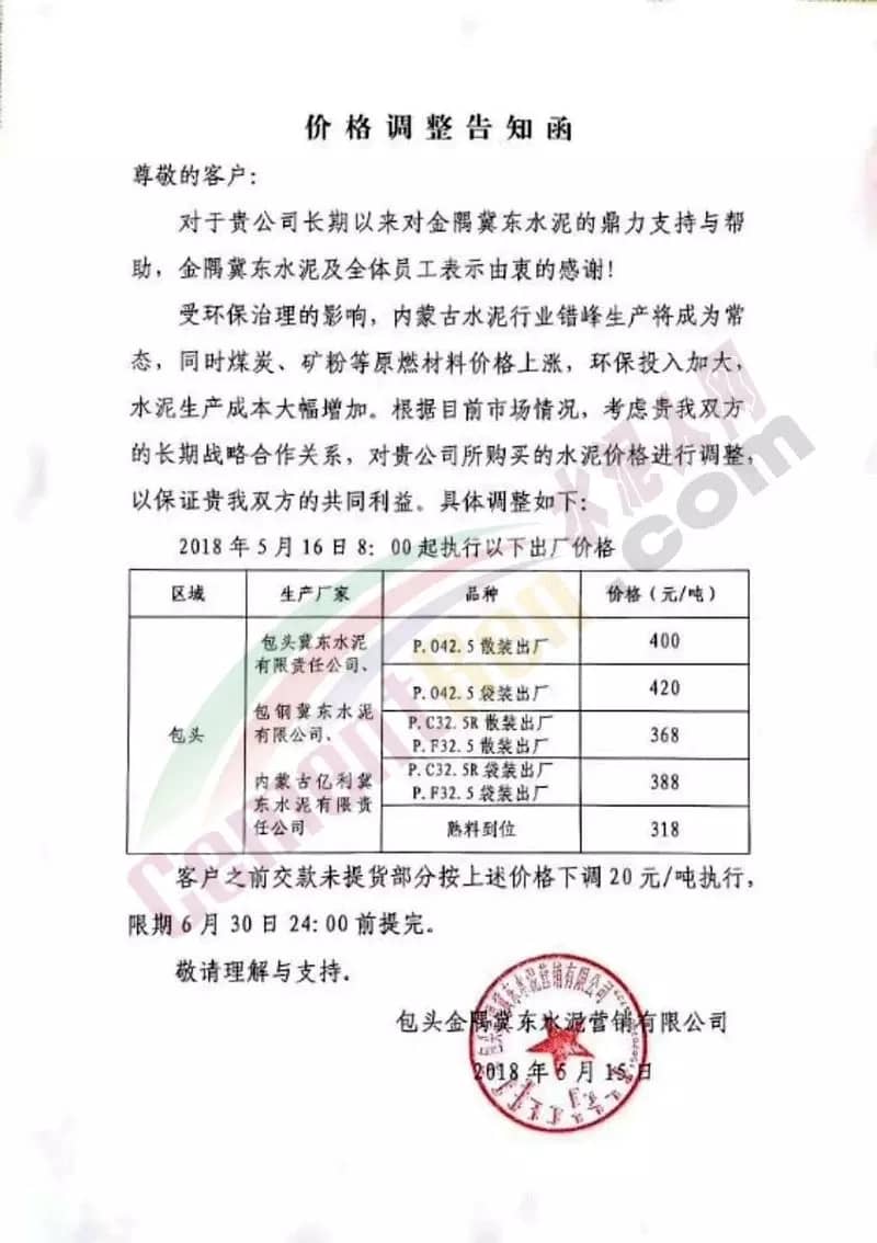 5月16日內(nèi)蒙古自治區(qū)呼和浩特市區(qū)域主導(dǎo)企業(yè)上調(diào)水泥價格同時包頭冀東金隅水泥也發(fā)通知上調(diào)水泥價格。