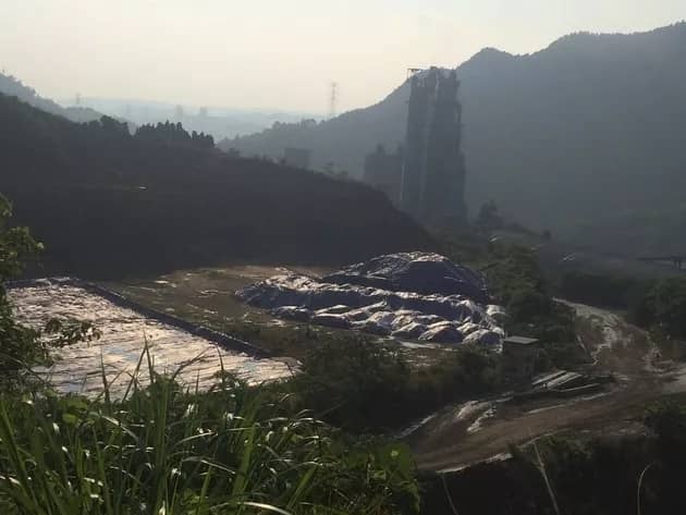 記者在野豬槽+295m平臺觀察到,剛好存在一處用藍色塑料布遮蓋的長約20m、寬約2m的土堆,疑似上述報告表中提及的污染土壤儲存場所。不過,該處并未設(shè)置混泥土圍擋,土堆的部分區(qū)域也裸露在外。