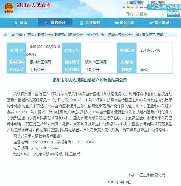 銀川東盛鑫水泥有限公司落后生產(chǎn)線已斷水?dāng)嚯?,供電部門(mén)已查封供配電裝置,因公司負(fù)責(zé)人無(wú)法聯(lián)系,尚不具備拆除主體設(shè)備條件。