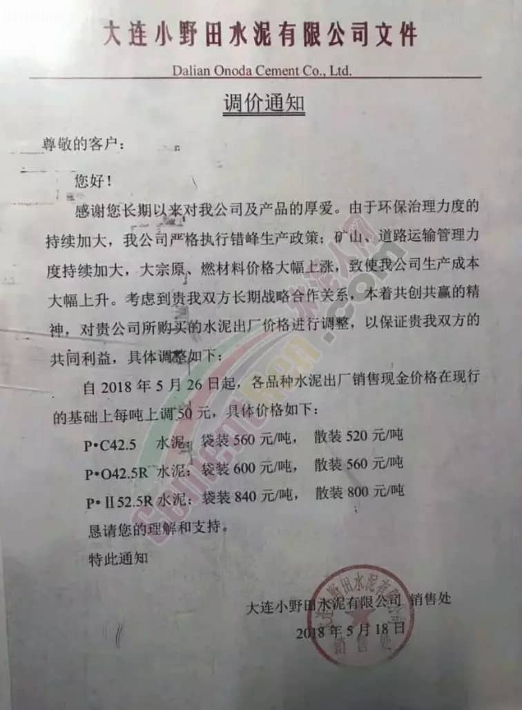 【水泥人網(wǎng)】日前,大連小野田水泥有限公司銷售處發(fā)布調(diào)價通知稱,由于環(huán)保治理力度的持續(xù)大加,公司嚴格執(zhí)行錯峰生產(chǎn)政策;礦山、道路運輸管理力度持續(xù)加大,大宗原、燃材料價格大幅上漲,致使公司生產(chǎn)成本大幅上升。為保證企業(yè)與用戶的共同利益,將水泥價格上調(diào)。其中P.II52.5R標號袋裝水泥執(zhí)行價格調(diào)為840元/噸。