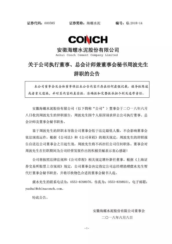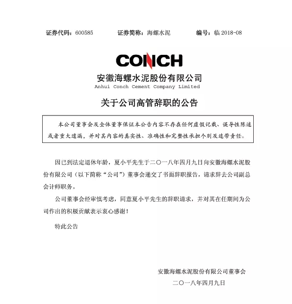 據(jù)了解,今年4月9日海螺水泥公司副總會計(jì)師夏小平先生因已到法定退休年齡于2018年4月9日向安徽海螺水泥股份有限公司董事會遞交了書面辭職報(bào)告,請求辭去公司副總會計(jì)師職務(wù)。公司董事會經(jīng)審慎考慮,同意夏小平先生的辭職請求,并對其在任期間為公司作出的積極貢獻(xiàn)表示了衷心感謝!