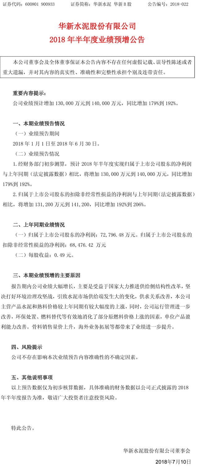 7月9日晚間海螺水泥、華新水泥、萬年青水泥等分別發(fā)布2018年上半年業(yè)績預(yù)告