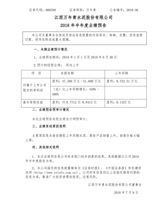 萬年青公告,預(yù)計(jì)2018年半年度實(shí)現(xiàn)歸屬于上市公司股東的凈利潤4.73億元–5.16億元,同比增長440%-490%。主要原因是本報(bào)告期較上年同期水泥、商砼產(chǎn)品銷量上升,銷售價(jià)格大幅上漲。