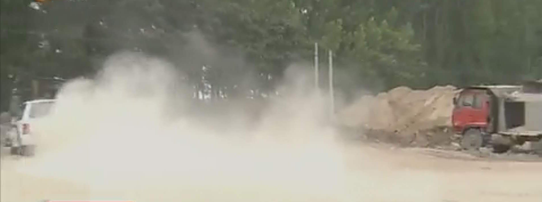 由于地面未經(jīng)硬化,積塵嚴(yán)重,僅僅一輛汽車(chē)駛過(guò),就掀起大量揚(yáng)塵,近距離內(nèi)讓人無(wú)法睜開(kāi)眼睛。而該碎石場(chǎng)距離村民住宅不足50米。