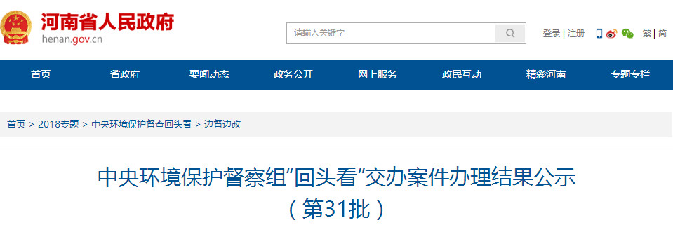 【水泥人網(wǎng)】日前,河南省人民政府官網(wǎng)發(fā)布《中央環(huán)境保護(hù)督察組“回頭看”交辦案件辦理結(jié)果公示(第31批)》名單,其中涉及天瑞集團(tuán)、同力水泥等水泥企業(yè),詳情如下: