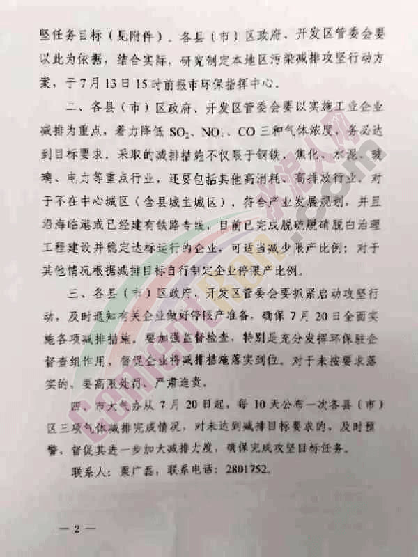 三、各縣(市)區(qū)政府、開發(fā)區(qū)管委會(huì)要抓緊啟動(dòng)攻堅(jiān)行動(dòng),及時(shí)通知有關(guān)全業(yè)做好停限產(chǎn)準(zhǔn)備,確保7月20日全面實(shí)施各項(xiàng)減排措施。要加強(qiáng)監(jiān)督檢查,特別是充分發(fā)揮環(huán)保駐企業(yè)督察組作用,督促企業(yè)將減排措施落實(shí)到位,對(duì)于未按照要求落實(shí)的,要高限處罰、嚴(yán)肅追責(zé)。