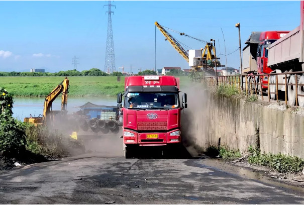 在費(fèi)龍口村督查時(shí),督查人員發(fā)現(xiàn)金華江沿岸有兩座碼頭,分別用于煤炭、砂石裝卸運(yùn)輸,大貨車(chē)出入頻繁,現(xiàn)場(chǎng)道路布滿灰塵煤渣,車(chē)輛駛過(guò)揚(yáng)塵明顯,場(chǎng)地上煤炭、沙石隨意堆放,無(wú)任何防塵措施。督查組現(xiàn)場(chǎng)盤(pán)問(wèn)了相關(guān)情況,對(duì)存在問(wèn)題進(jìn)行記錄,并拍攝了揚(yáng)塵實(shí)況。