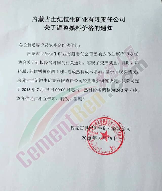 據(jù)水泥人網(wǎng)了解,烏蘭察布市區(qū)域內(nèi)中聯(lián)水泥、冀東水泥等集團(tuán)企業(yè)熟料不做對(duì)外銷(xiāo)售僅供應(yīng)內(nèi)部粉磨站。內(nèi)蒙世紀(jì)恒生礦業(yè)有限公司本次上調(diào)熟料價(jià)格或?qū)?dòng)整個(gè)烏蘭察布市熟料市場(chǎng)價(jià)格上揚(yáng)。