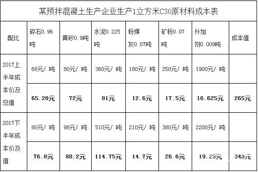 從上表可以算出,2017年上半年和下半年水泥、砂石骨料(碎石和黃砂)占總成本值的比重分別為30.57%、51.80%和33.75%、48.53%。水泥和砂石骨料進(jìn)貨價(jià)格變動(dòng)對(duì)預(yù)拌混凝土生產(chǎn)成本影響較大。