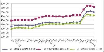 今年1-3月份42.5強(qiáng)度散裝普通硅酸鹽水泥價(jià)格分別為:502.33元/噸、510.47元/噸、500.07元/噸,價(jià)格沖高回落,52.5強(qiáng)度散裝普通硅酸鹽水泥價(jià)格分別為:574.20元/噸、576.07元/噸、561.67元/噸,價(jià)格也是沖高回落。