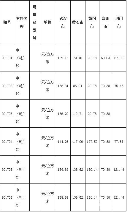 砂石骨料等原材料為地產(chǎn)材料,各地價(jià)格情況差異較大。部分地區(qū)因原材料供應(yīng)緊張,價(jià)格較高。湖北省部分地區(qū)2017年砂石骨料價(jià)格呈大幅上漲走勢(shì),部分地區(qū)價(jià)格較穩(wěn)定。我們抽取武漢、黃石、黃岡、襄陽、荊門5地砂和碎石價(jià)格進(jìn)行比較。