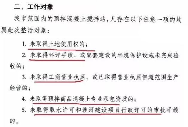 此次整治對(duì)象:(1)未取得土地使用權(quán)的;(2)未取得環(huán)評(píng)手續(xù),或配套建設(shè)的環(huán)境保護(hù)設(shè)施未完成驗(yàn)收的;(3)未取得工商營(yíng)業(yè)執(zhí)照,或已取得營(yíng)業(yè)執(zhí)照但超范圍生產(chǎn)經(jīng)營(yíng)的;(4)未取得預(yù)拌商品混凝土專業(yè)承包資質(zhì)的;(5)未取得取水許可和涉河建設(shè)項(xiàng)目行政許可的審批手續(xù)的。