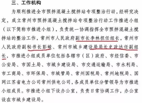 為順利推進(jìn)全市預(yù)拌混凝土攪拌站專項(xiàng)整治行動(dòng),成立常州市預(yù)拌混凝土攪拌站專項(xiàng)整治行動(dòng)工作推進(jìn)小組,常州市人民政府副市長(zhǎng)李林擔(dān)任組長(zhǎng)。