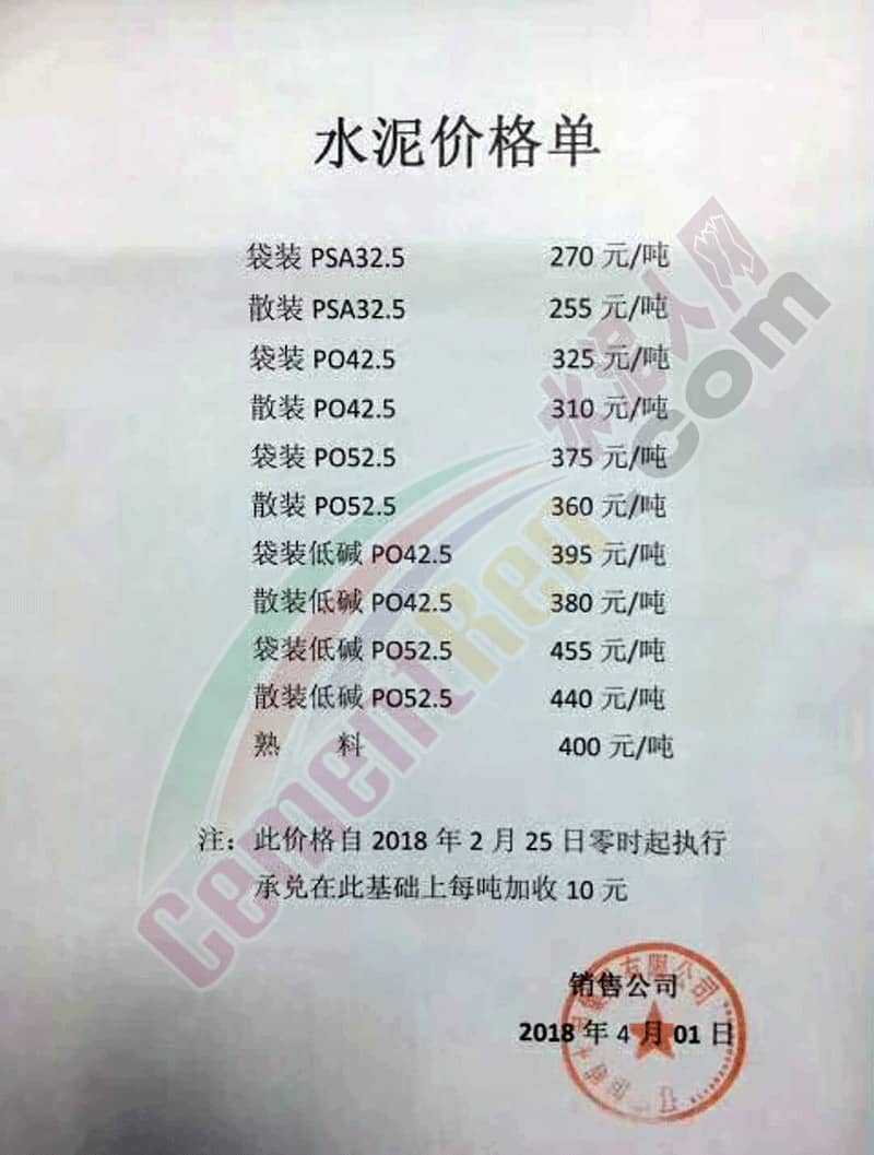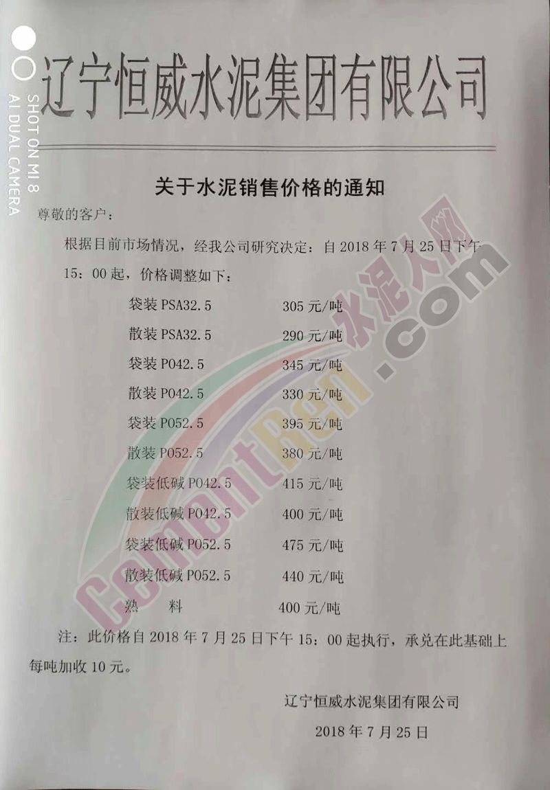 【水泥人網(wǎng)】昨日(25日)遼寧恒威水泥集團(tuán)有限公司發(fā)布關(guān)于水泥銷售價(jià)格的通知,通知稱,根據(jù)目前市場(chǎng)情況,經(jīng)公司研究決定,自2018年7月25日下午15時(shí)起,調(diào)整各品種水泥產(chǎn)品價(jià)格。詳情如下: