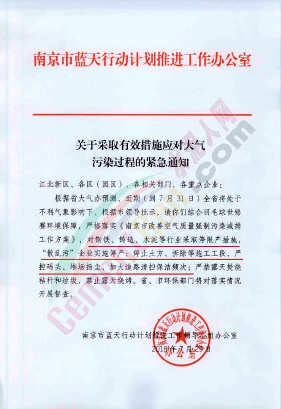 同時(shí),實(shí)施工地停工,除市政重點(diǎn)工程外,南京市范圍內(nèi)工地全部停工,對停工工地裸露地采取防塵降塵措施?;炷翑嚢枵就.a(chǎn)。