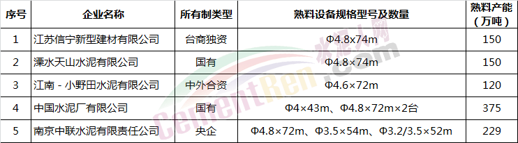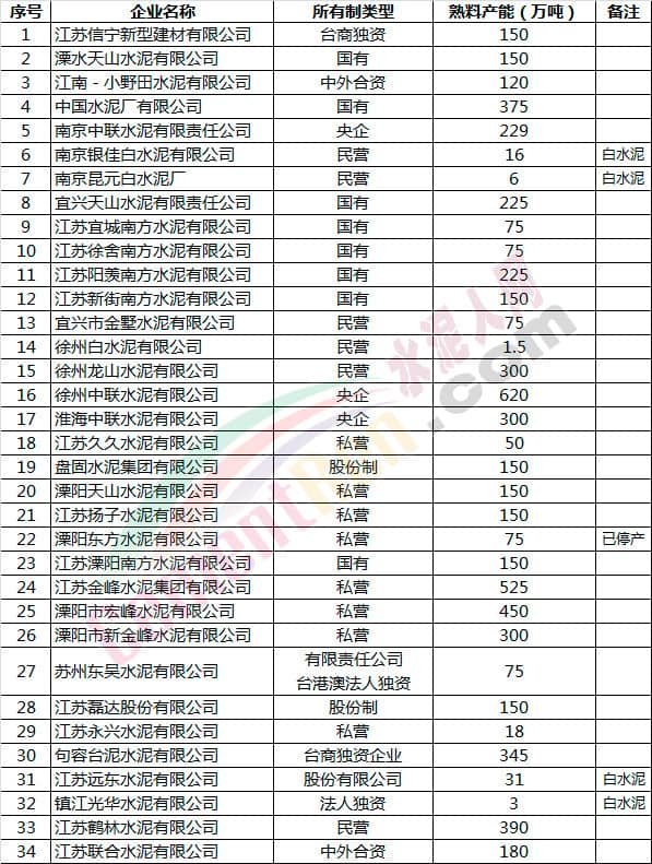 江蘇省部分水泥熟料生產(chǎn)企業(yè)名單