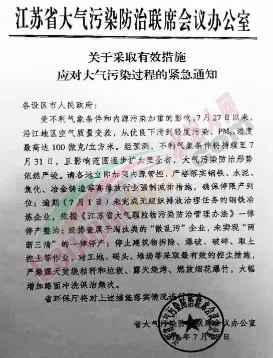 同期(7月28日),江蘇省大氣污染防治聯(lián)席會議辦公室發(fā)布《關(guān)于采取有效措施應(yīng)對大氣污染過程的緊急通知》稱,受不利氣象條件和內(nèi)源污染加重的影響,7月27日以來,沿江地區(qū)空氣質(zhì)量變差,從優(yōu)良下滑到輕度污染PM2.5濃度最高達(dá)100微克/立方米。