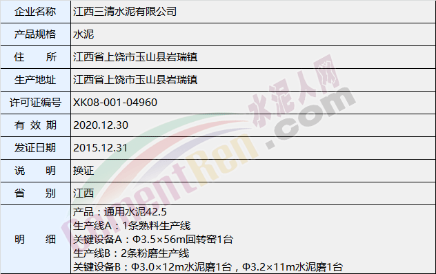 據(jù)質(zhì)監(jiān)總局生產(chǎn)許可證辦公室數(shù)據(jù)顯示,江西三清水泥有限公司生產(chǎn)地址位置江西省上饒市玉山縣巖瑞鎮(zhèn),原生產(chǎn)線規(guī)模為一條熟料生產(chǎn)線,關(guān)鍵設(shè)備為Φ3.5×56m回轉(zhuǎn)窯1臺。兩條水泥粉磨生產(chǎn)線,關(guān)鍵設(shè)備為Φ3.0×12m水泥磨1臺,Φ3.2×11m水泥磨1臺。