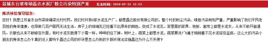 留言稱,村內(nèi)共有6家水泥生產(chǎn)廠,都是磊達股份有限公司的,整個村的粉塵污染、噪音污染特別嚴(yán)重,嚴(yán)重影響了平民老百姓的身體健康,也導(dǎo)致幾百戶居民無法生活。