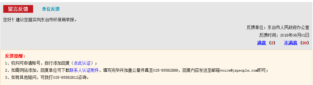 針對這條留言,東臺市人民政府辦公室在2018年08月01日時反饋建議留言者據(jù)實向東臺市環(huán)保局舉報。