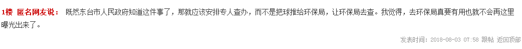 針對這一回復(fù),某匿名網(wǎng)友表示: 既然東臺市人民政府知道這件事了,那就應(yīng)該安排專人查辦,而不是把球推給環(huán)保局,讓環(huán)保局去查。去環(huán)保局真要有用也就不會在“留言板”上曝光出來了。