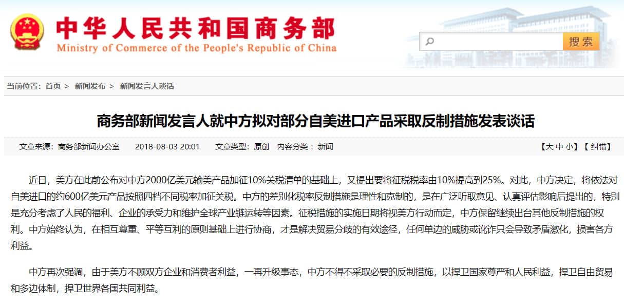 據(jù)央視新聞客戶(hù)端消息,2018年7月11日,美國(guó)政府發(fā)布了對(duì)從中國(guó)進(jìn)口的約2000億美元商品加征10%關(guān)稅的措施。8月2日,美國(guó)貿(mào)易代表聲明稱(chēng)擬將加征稅率由10%提高至25%。美方背離了雙方多次磋商共識(shí),單方面再次升級(jí)了貿(mào)易戰(zhàn),嚴(yán)重違反世界貿(mào)易組織規(guī)則,破壞全球產(chǎn)業(yè)鏈和自由貿(mào)易體制,實(shí)質(zhì)性損害了我國(guó)國(guó)家和人民利益,也將對(duì)包括美國(guó)在內(nèi)的世界經(jīng)濟(jì)發(fā)展造成負(fù)面影響。