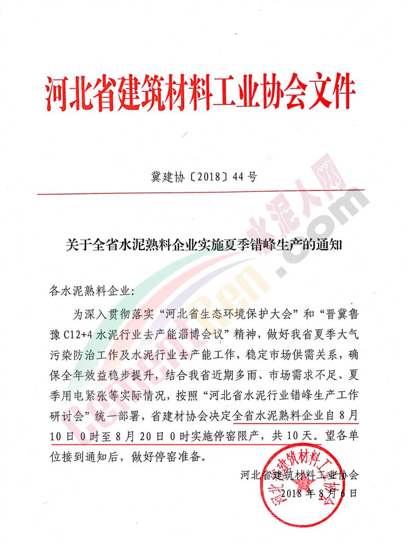 【水泥人網(wǎng)】水泥人網(wǎng)消息,昨日(8月6日)河北省建筑材料工業(yè)協(xié)會(huì)發(fā)布冀建協(xié)【2018】44號(hào)文件,《關(guān)于全省水泥熟料企業(yè)實(shí)施夏季錯(cuò)峰生產(chǎn)的通知》(以下簡(jiǎn)稱“通知文件”。