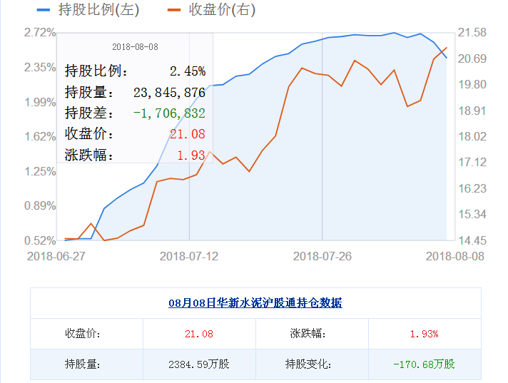 【水泥人網(wǎng)】數(shù)據(jù)顯示,截至08月08日華新水泥于滬股通持股量為2384.59萬(wàn)股,占其A股股本比例為2.45%,比上一交易日減少170.68萬(wàn)股。