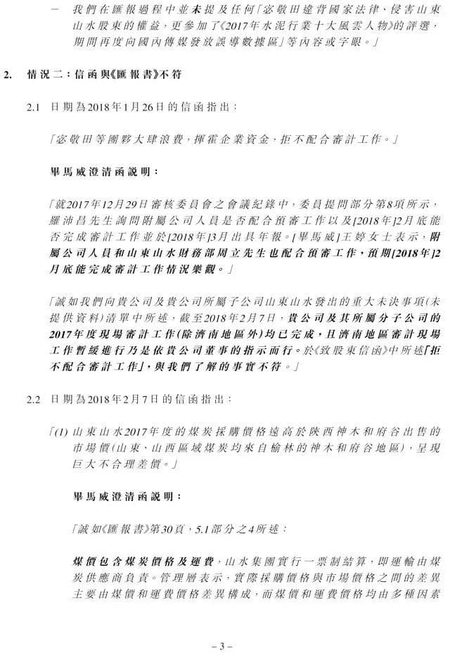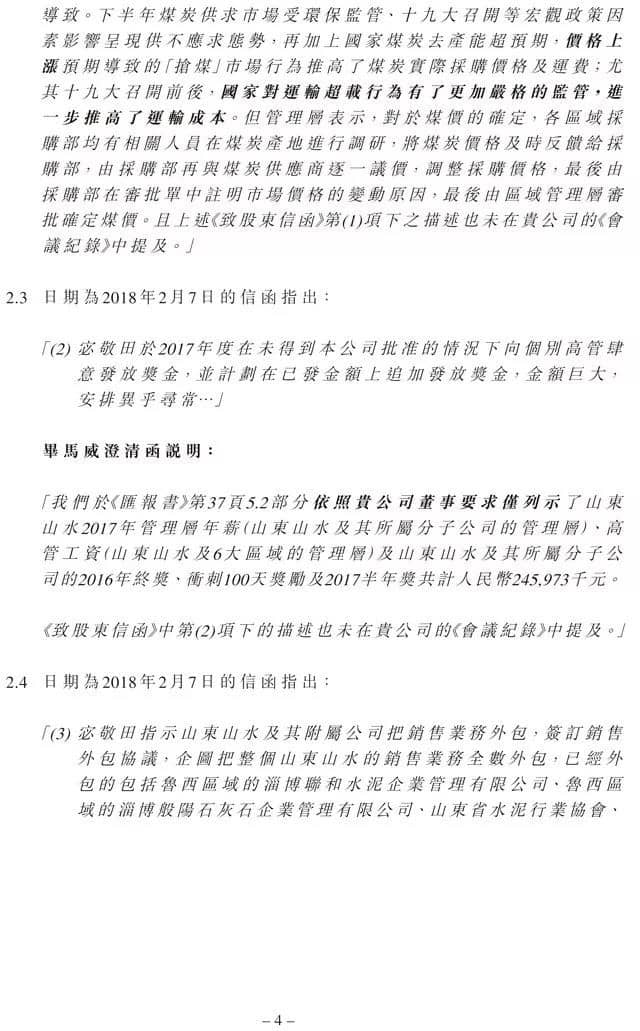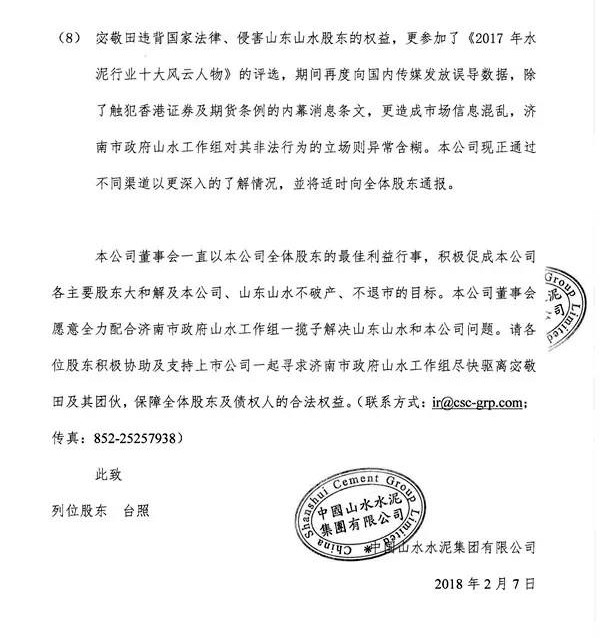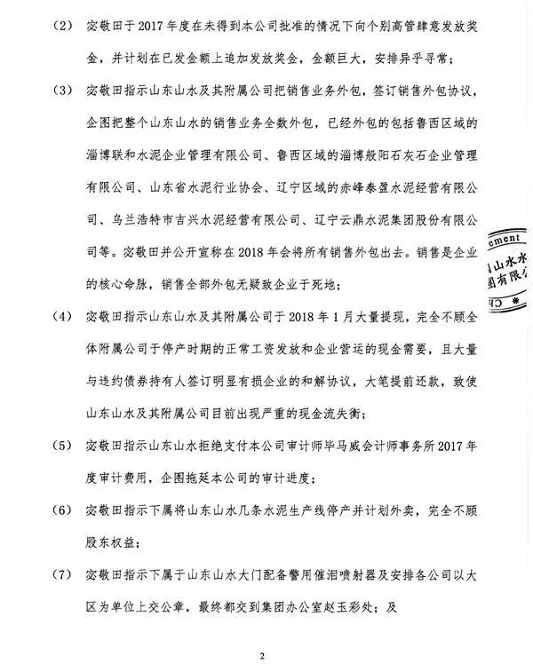 宓敬田指示山東水泥及其附屬公司于2018年1月大量體現(xiàn),完全不顧全體附屬公司于停產(chǎn)時(shí)期的正常工作發(fā)放和企業(yè)營運(yùn)的現(xiàn)金需要,等等。