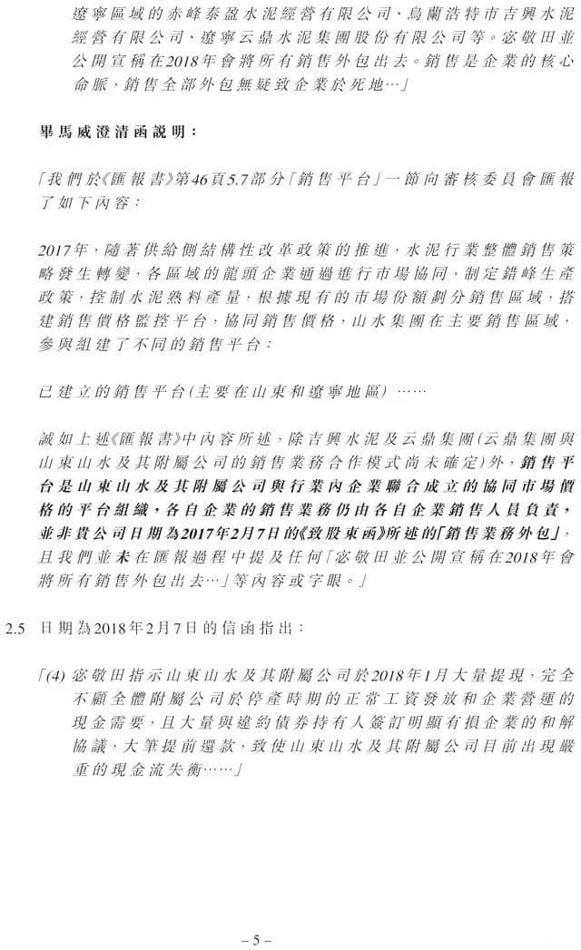 針對(duì)“計(jì)劃出售生產(chǎn)線”一項(xiàng),畢馬威表示,“我們?cè)趨R報(bào)中并未提及任何‘宓敬田指示下屬將山東山水幾條水泥生產(chǎn)線停產(chǎn)并計(jì)劃外賣’等內(nèi)容或字眼。”