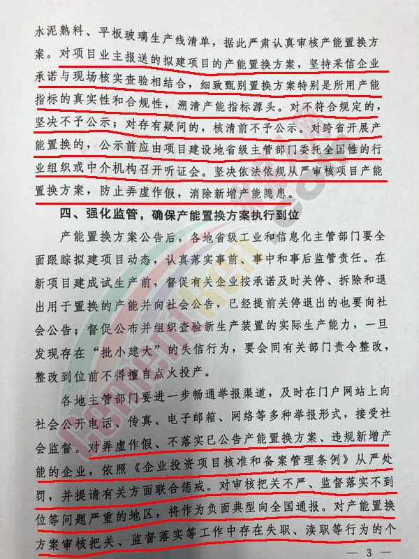 各地負責建設項目備案的部門要認真執(zhí)行《國務院關于發(fā)布政府核準的投資項目目錄(2016年本)的通知》(國發(fā)[2016]72號)要求,嚴格把好水泥熟料、平板玻璃建設項目備案源頭關口,不得以其他任何名義、任何方式備案新增水泥熟料、平板玻璃產(chǎn)能的建設項目;各相關部門和機構不得辦理土地供應、能評、環(huán)評審批和新增授信支持等相關業(yè)務。對確有必要新建的水泥熟料、平板玻璃建設項目,必須嚴格按照《水泥平板玻璃行業(yè)產(chǎn)能置換實施辦法》(工信部原[2017]337號)實施等量或減量置換,需持有經(jīng)當?shù)厥〖壒I(yè)和信息化主管部門公告的產(chǎn)能置換方案。