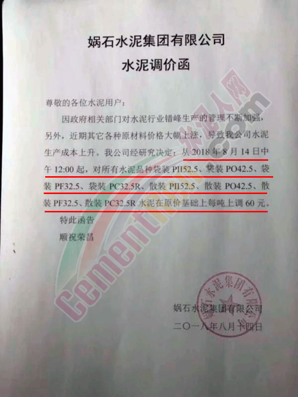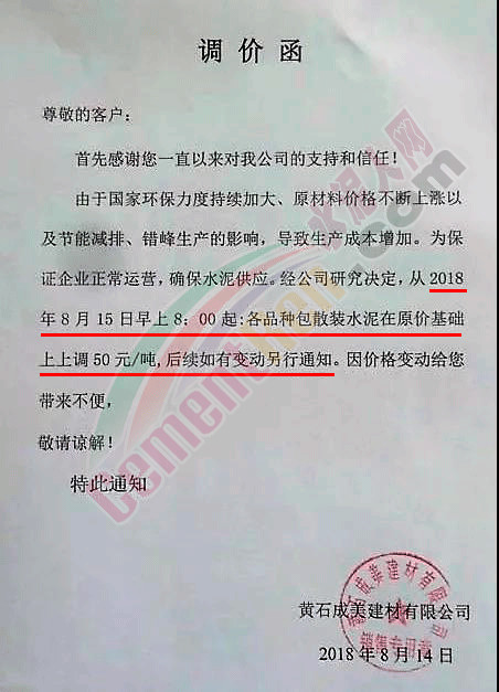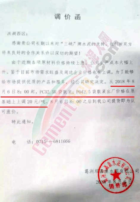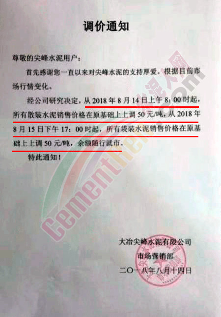 【水泥人網(wǎng)】繼上周河南地區(qū)宣布全區(qū)域提價(jià)之后,湖北部分地區(qū)也通知客戶上調(diào)出廠價(jià)格,漲幅在50-65元/噸。據(jù)水泥人網(wǎng)了解,目前區(qū)域內(nèi)水泥熟料庫位較低,加之進(jìn)入八月中旬下游需求有所提升。調(diào)提價(jià)通知如下: