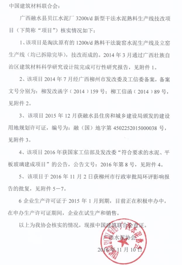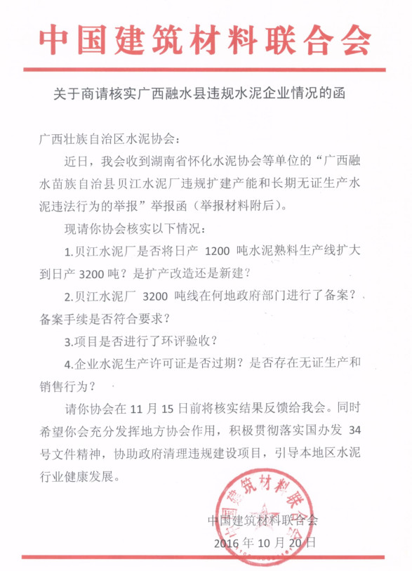 對(duì)此,懷化水泥協(xié)會(huì)于2016年10月12日,向中國(guó)建材聯(lián)合會(huì)及國(guó)家有關(guān)部門舉報(bào)了該公司的違法違規(guī)行為,得到了中國(guó)建材聯(lián)合會(huì)的高度重視,并于2016年10月20日向廣西自治區(qū)水泥協(xié)會(huì)發(fā)出了《關(guān)于商請(qǐng)核實(shí)廣西融水縣違規(guī)水泥企業(yè)情況的函》(見(jiàn)附件三)。