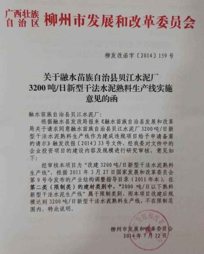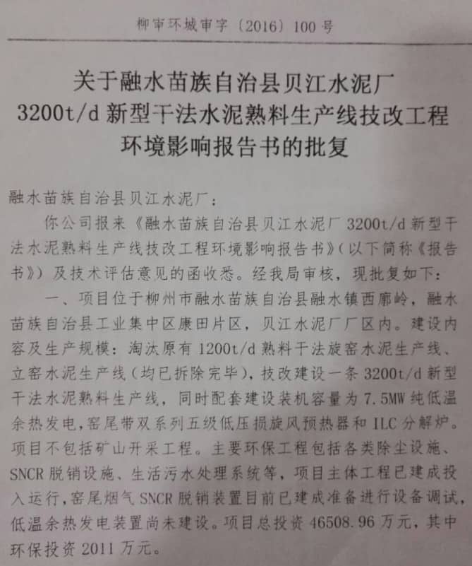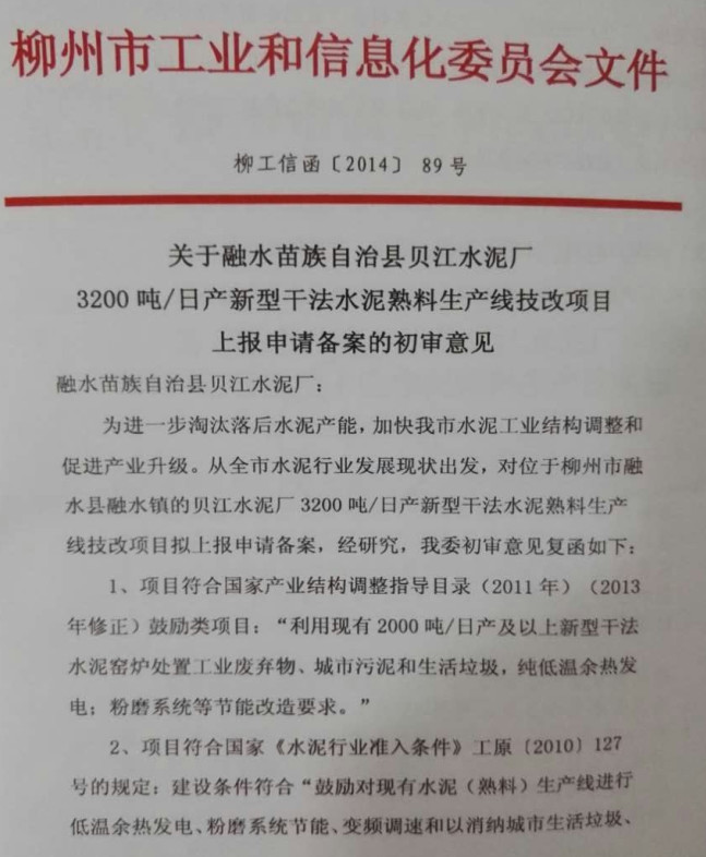 1、強(qiáng)行技改,違規(guī)擴(kuò)建。融水縣貝江水泥有限公司原來(lái)是一條日產(chǎn)1200噸熟料的水泥生產(chǎn)線。2013年,該公司在沒(méi)有獲得廣西自治區(qū)經(jīng)信委的核準(zhǔn)文件,沒(méi)有獲得建設(shè)項(xiàng)目用地批文,沒(méi)有獲得環(huán)境影響報(bào)告書(shū)批復(fù)等必備手續(xù)的情況下,借技改之名,擅自將日產(chǎn)1200噸生產(chǎn)線擴(kuò)大到日產(chǎn)3200噸。在項(xiàng)目的擴(kuò)建期間,國(guó)務(wù)院國(guó)發(fā)〔2013〕41號(hào)文件明文規(guī)定“各地方、各部門不得以任何名義、任何方式核準(zhǔn)、備案產(chǎn)能嚴(yán)重過(guò)剩行業(yè)新增產(chǎn)能項(xiàng)目”;國(guó)家發(fā)改委、工信部發(fā)改產(chǎn)業(yè)[2013]892號(hào)文件三令五申“對(duì)未批先建、邊批邊建、越權(quán)核準(zhǔn)的違規(guī)項(xiàng)目,尚未開(kāi)工建設(shè)的,不準(zhǔn)開(kāi)工,正在建設(shè)的項(xiàng)目,要停止建設(shè)”。但是該公司對(duì)國(guó)家三令五申的產(chǎn)業(yè)政策和法律法規(guī)置若罔聞,仍然我行我素,強(qiáng)行技改,并于2014年8月20日強(qiáng)行投產(chǎn)。