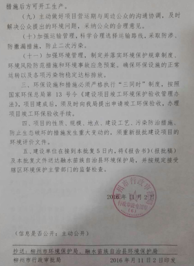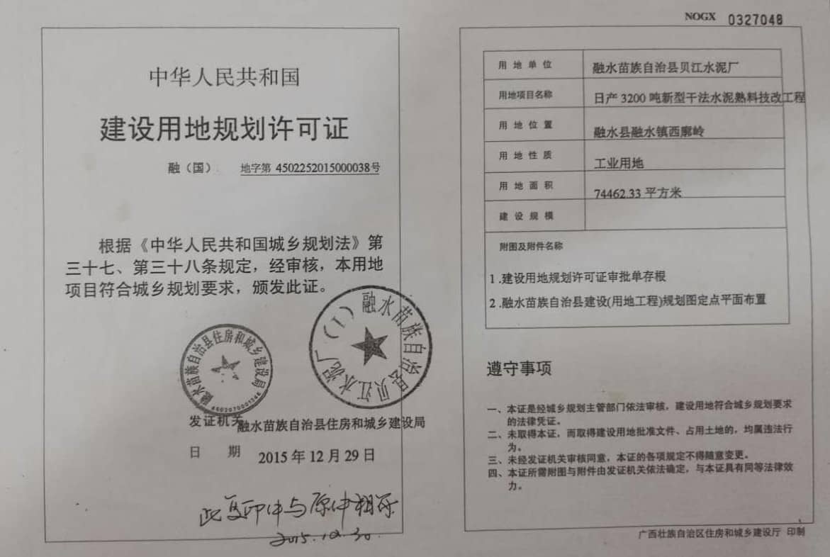 從廣西水泥協(xié)會(huì)2016年11月10日給聯(lián)合會(huì)的回復(fù)函中(見(jiàn)附件四),可以看到,這個(gè)技改項(xiàng)目是在2014年8月20日正式投產(chǎn)前的一個(gè)月,才分別于7月16日和7月22日,到柳州市經(jīng)信委和發(fā)改委進(jìn)行備案。柳州市工信委只是出具了一個(gè)《初審意見(jiàn)》(見(jiàn)附件五),柳州市發(fā)改委出具的則只是一個(gè)帶證明性質(zhì)的《意見(jiàn)函》(見(jiàn)附件六),根本沒(méi)有獲得省級(jí)政府主管部門以上的技改核準(zhǔn)文件;而且建設(shè)用地規(guī)劃許可證,是在投產(chǎn)后一年多以后的2015年12月29日才獲得批準(zhǔn)的(見(jiàn)附件七);環(huán)境影響報(bào)告書(shū)也是到投產(chǎn)兩年多以后的2016年11月2日,才得到柳州市行政審批局的批復(fù)文件(見(jiàn)附件八)。