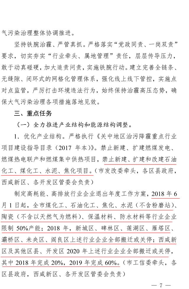 按照計(jì)劃,2018年6月1日起,西安全市煤化工、石油化工、焦化、水泥(不含粉磨站)、陶瓷(不含以天然氣為燃料)、保溫材料、防水材料等行業(yè)企業(yè)限制50%產(chǎn)能。2018年,城市六區(qū)及閻良區(qū)上述行業(yè)企業(yè)全部搬遷或關(guān)停。西咸新區(qū)及其他區(qū)縣、開發(fā)區(qū)2020年上述行業(yè)企業(yè)全部搬遷或關(guān)停。到2020年,基本建成“無煤化”城市。