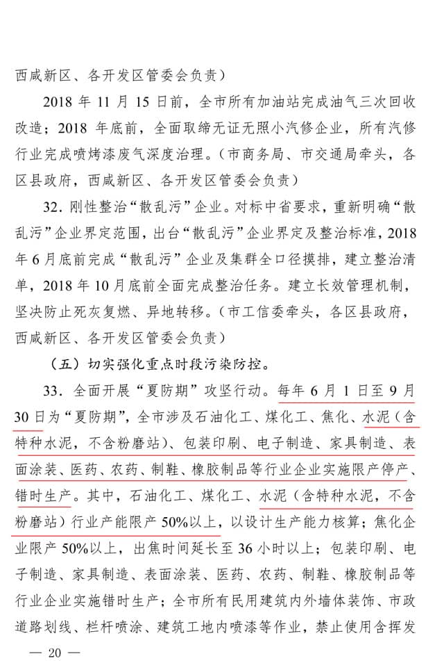 根據(jù)文件,西安市全面開展“夏防期”攻堅(jiān)行動(dòng)。每年 6 月 1 日至 9 月 30 日為“夏防期” ,全市涉及石油化工、煤化工、焦化、水泥(含特種水泥,不含粉磨站)、包裝印刷、電子制造、家具制造、表面涂裝、醫(yī)藥、農(nóng)藥、制鞋、橡膠制品等行業(yè)企業(yè)實(shí)施限產(chǎn)停產(chǎn)、錯(cuò)時(shí)生產(chǎn)。其中,石油化工、煤化工、水泥(含特種水泥,不含 粉磨站)行業(yè)產(chǎn)能限產(chǎn) 50%以上,以設(shè)計(jì)生產(chǎn)能力核算;焦化企 業(yè)限產(chǎn) 50%以上,出焦時(shí)間延長至 36 小時(shí)以上;包裝印刷、電子制造、家具制造、表面涂裝、醫(yī)藥、農(nóng)藥、制鞋、橡膠制品等行業(yè)企業(yè)實(shí)施錯(cuò)時(shí)生產(chǎn);全市所有民用建筑內(nèi)外墻體裝飾、市政道路劃線、欄桿噴涂、建筑工地內(nèi)噴漆等作業(yè),禁止使用含揮發(fā)性有機(jī)溶劑的涂料;機(jī)動(dòng)車參照“冬防期”限行辦法實(shí)施限行管控,必要時(shí)實(shí)施機(jī)動(dòng)車單雙號限行措施。
